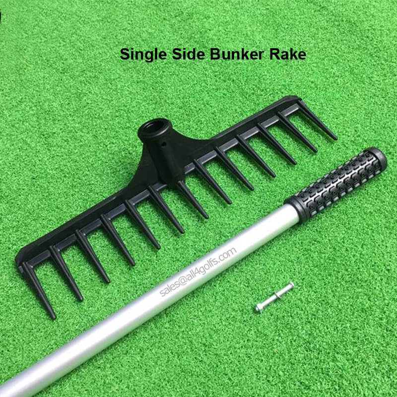 This one side bunker rake is with 13 pins, plastic rake head and aluminium handle with plastic handle cover. Size is 37cm rake head width and 140cm handle length.